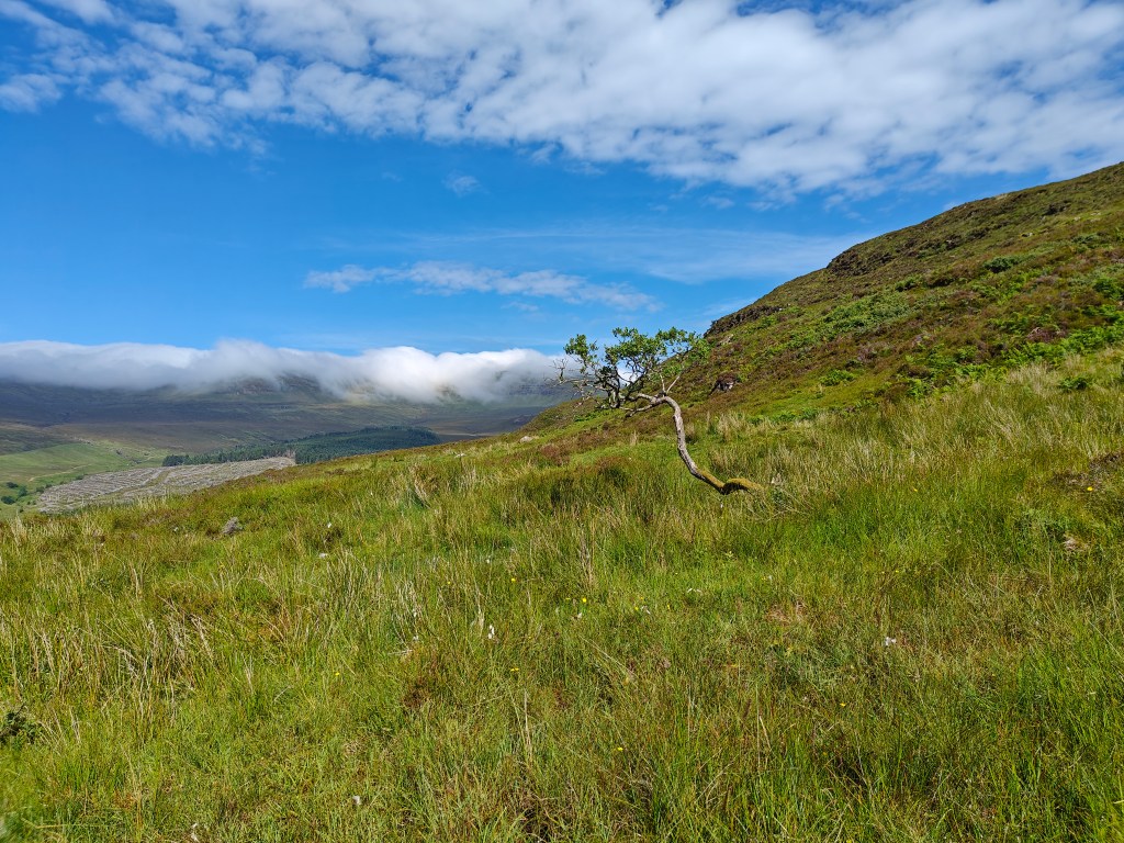 You’ll eventually reach a plateu of sorts where you start to get a view towards the south and Beinn a Chapuill, from here you have a few options, but likely the driest is to attempt to head towards Sron nan Aighean (Nose of the Heifers in Gaelic) hill, attempting to keep between the natural waterways shown on the maps, this will lead to a steep climb from roughly 300 to 420 metres in altitude, which can be tough going due to the spongy ground, high heather and steep incline.