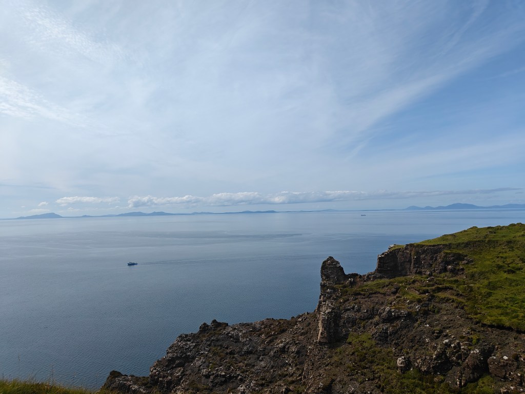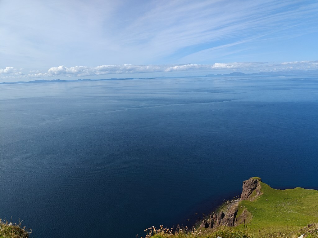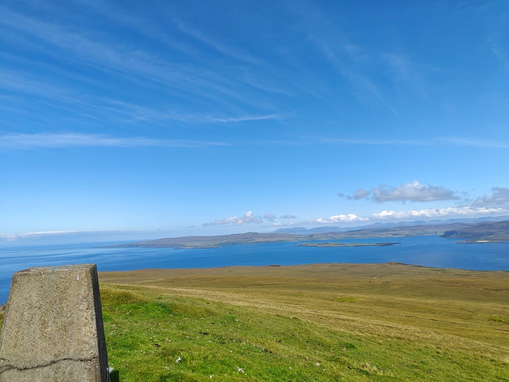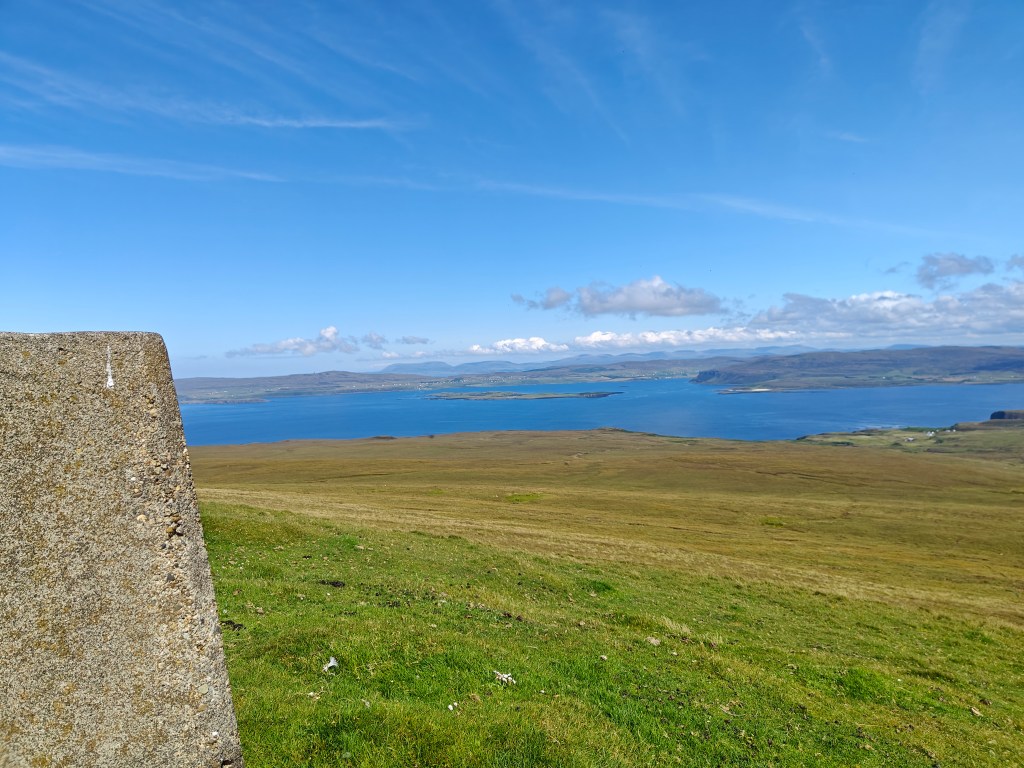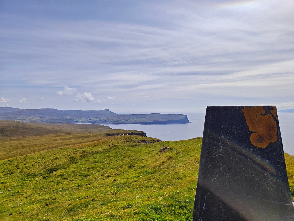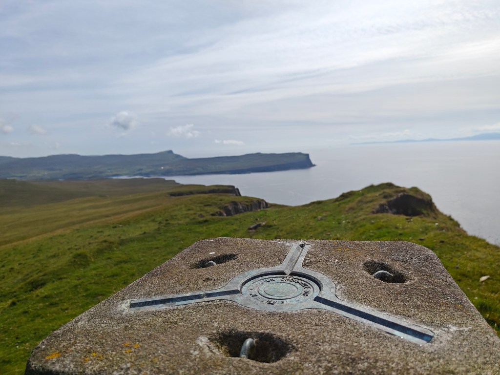 Exercise caution as you approach the Trig Point, as it stands just a meter or so short of a sheer cliff face that plunges nearly 1026 feet to the sea. This Trig Point offers breathtaking views of the surrounding area, including stunning vistas of the Outer Hebrides on clear days.