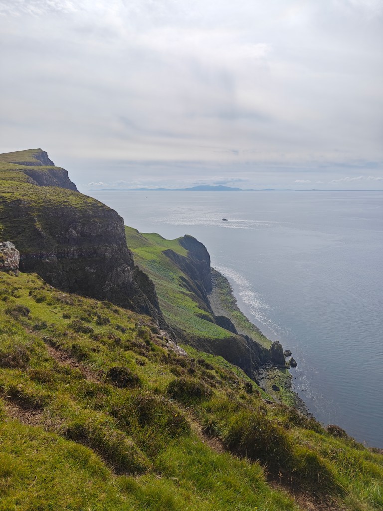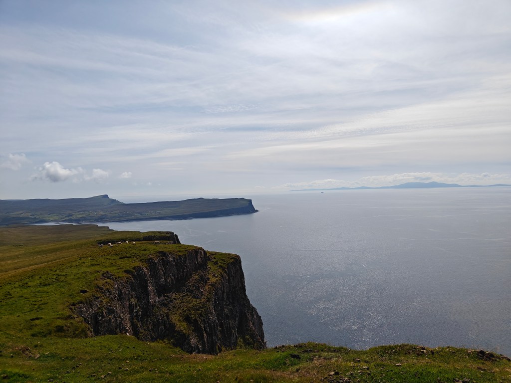 To return, follow the well-defined sheep trails along the cliff face to the northeast. Be sure to look back occasionally to take in the scenic views of the cliffs. The track may be broken at various points, but continue to follow it around the northern tip of Dunvegan Head.