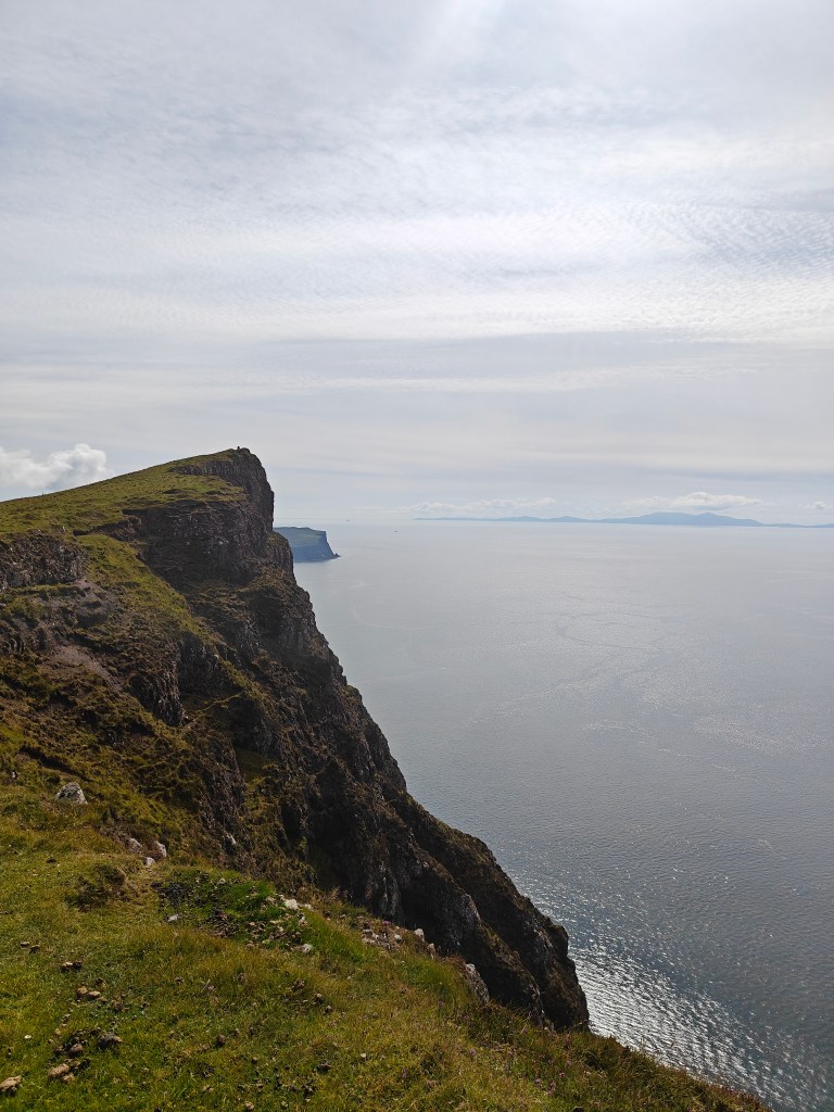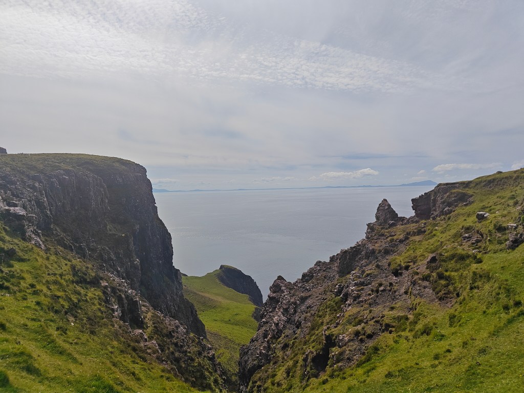 Upon reaching the crofting village, head left until you reach the back corner of the field. Here, you’ll spot a small stream and a rusted red iron gate. Cross the stream, go through the gate, and head directly up the hill towards the Trig Point, which is visible at the highest point of Dunvegan Head to the northwest, directly north of Geodha na Gliongraich, meaning “Clinking Cove” in Gaelic.