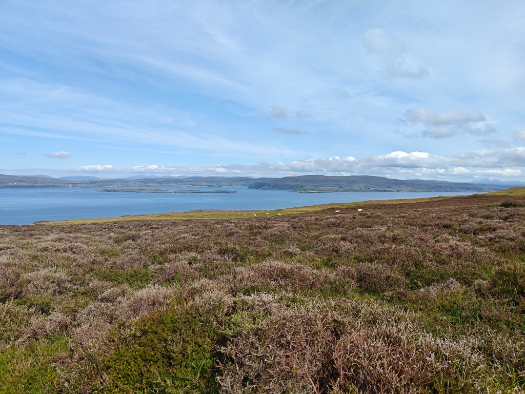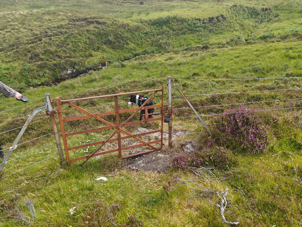 As you reach the eastern side of the route, the trek becomes less defined. Follow sheep trails where possible while making your way south. Once Galtrigill comes into view, head southwest, aiming for the rusted iron gate you passed through earlier in the journey.