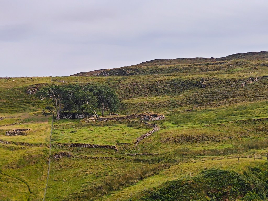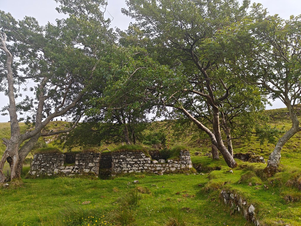 Galtrigill is a largely abandoned crofting township that once comprised thirty-two roofed buildings, as shown on the 1st edition of the OS map. Some stunning examples of clearance buildings are still visible, the most notable of which is nestled among a group of alder and aspen trees. This may be the ruined house of Donald Macleod, tacksman of Galtrigill, who is said to have briefly sheltered Bonnie Prince Charlie during his escape through Skye.