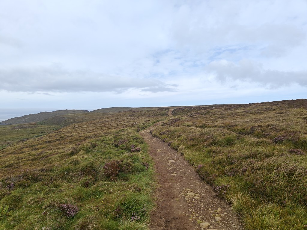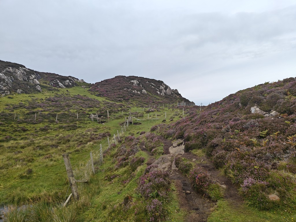 Eventually, you’ll come across a stile shortly after you first see Ben Volovaig fully in view to the east. Cross the stile and either follow the fence line a short distance north before heading towards the dike and Ben Volovaig, head straight for the hill, or continue along the trail to the southeast, doubling back to the hill at your chosen point. Regardless of your approach, you’ll need to cross a fence that encircles the hill’s peaks.
