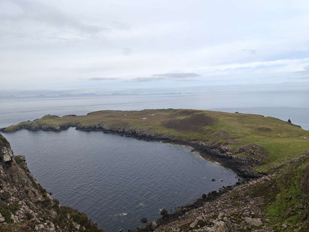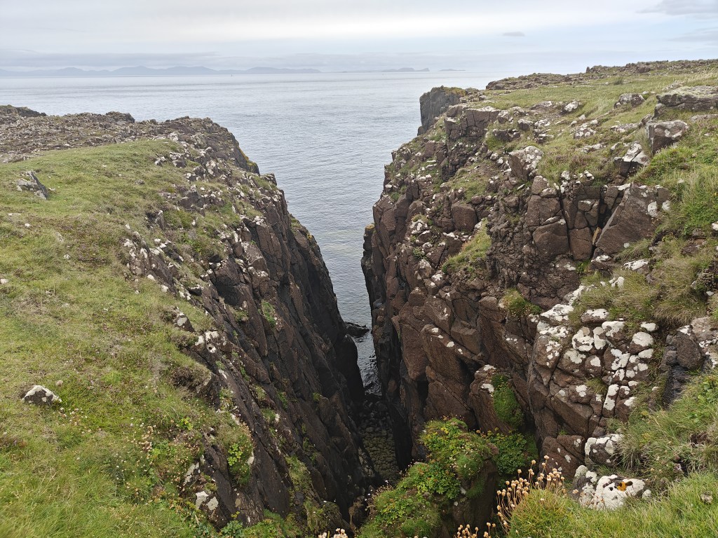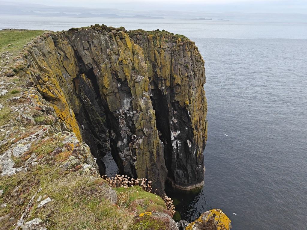 Continue through several gates until you reach the glen between Meall Deas and Meall Tuath (South and North Hills in Gaelic). For those aiming to reach the most northerly point of the island—a must-do if you can—head straight towards the cliff face in front of you, cross the step stile, and proceed through the gate. Carefully descend the well-marked path down the cliff face (avoid doing this section in wet or windy conditions). Once at the bottom, follow the established paths, favoring the eastern side of the peninsula to avoid boggy terrain and to enjoy the nesting birds along the cliffs and stone arches by the shore.