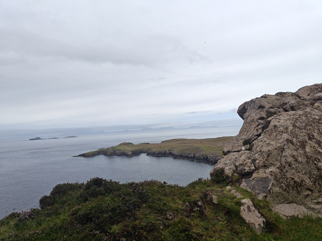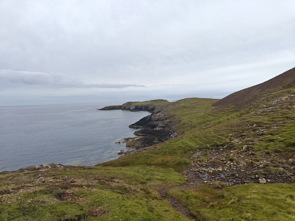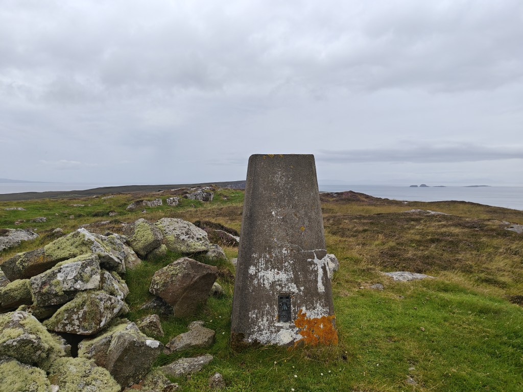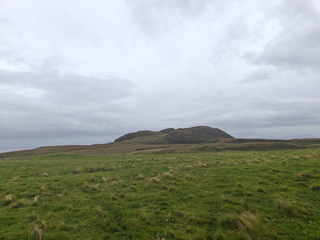 Due to Ben Volovaig’s south-facing cliff face, descending directly is challenging. I suggest heading east from the trig point, following sheep trails and rocky sections to descend into the fields below.