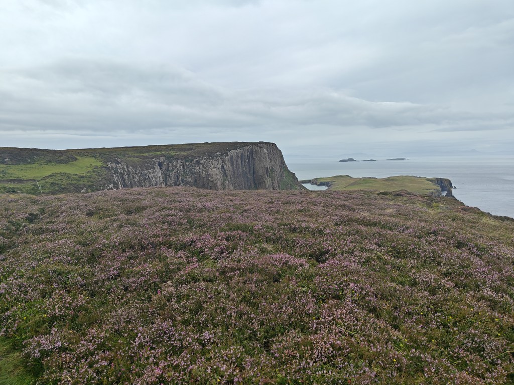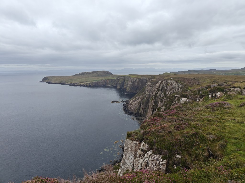 To begin the walk, park at the Rubha Hunish Car Park, located just uphill from the red Shulista phone box. There’s space for 8-12 cars in the area. Start by crossing the cattle grid to the north, then follow the trail signposted “Rubha Hunish 2.5km” to the left.