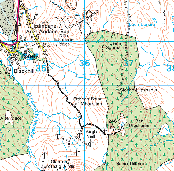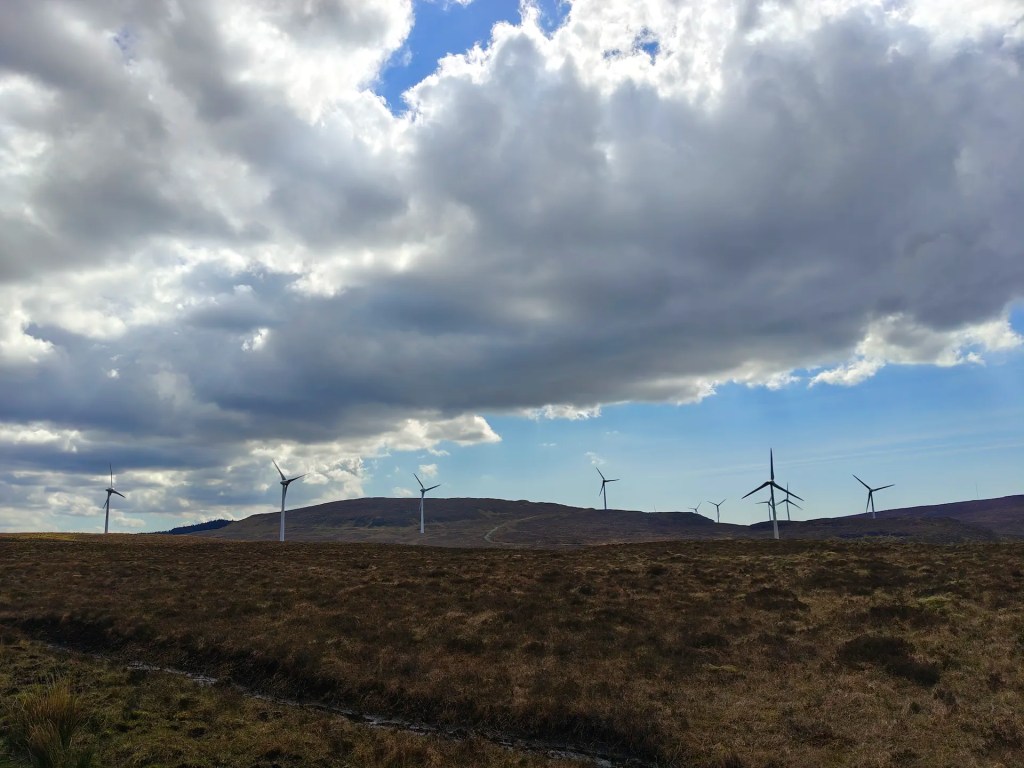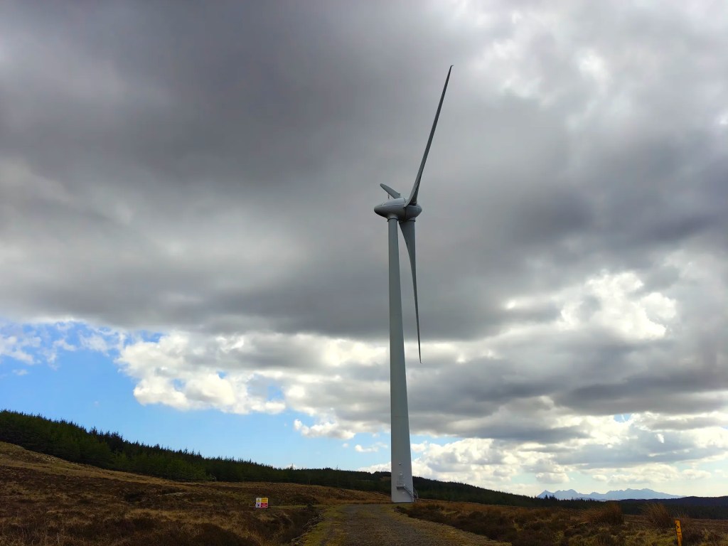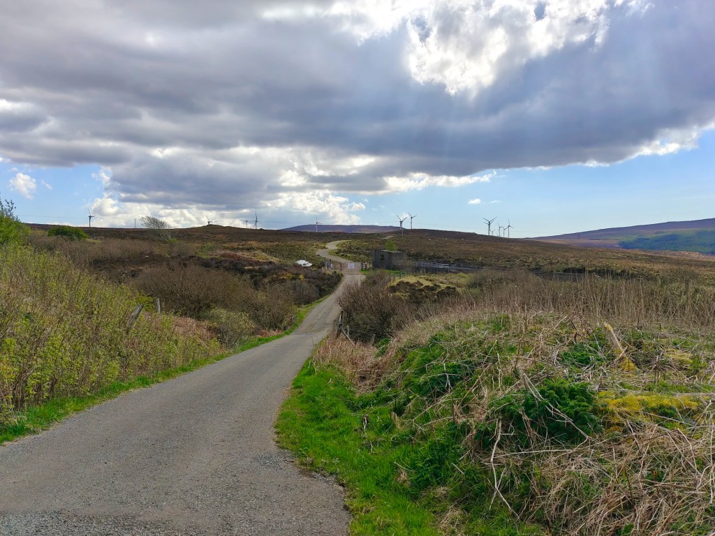 As you continue, you’ll come to another gate. Pass through it and take the left-hand path that curves around toward the easternmost wind turbine. This route gradually leads you in the direction of Ben Uigshader.