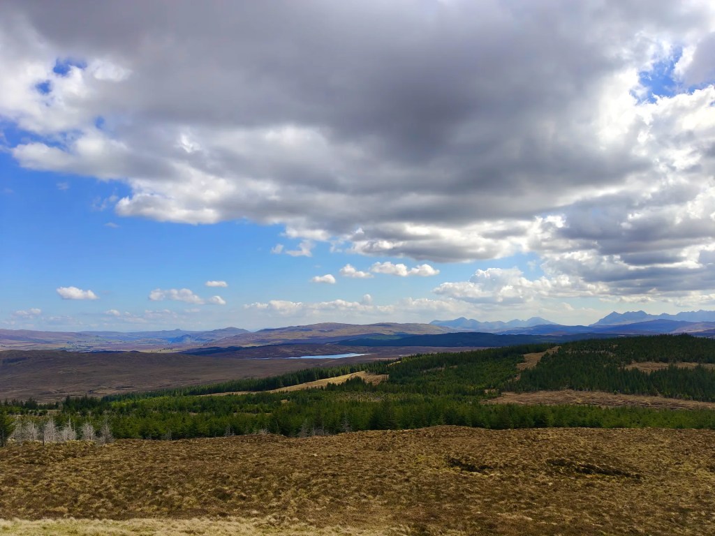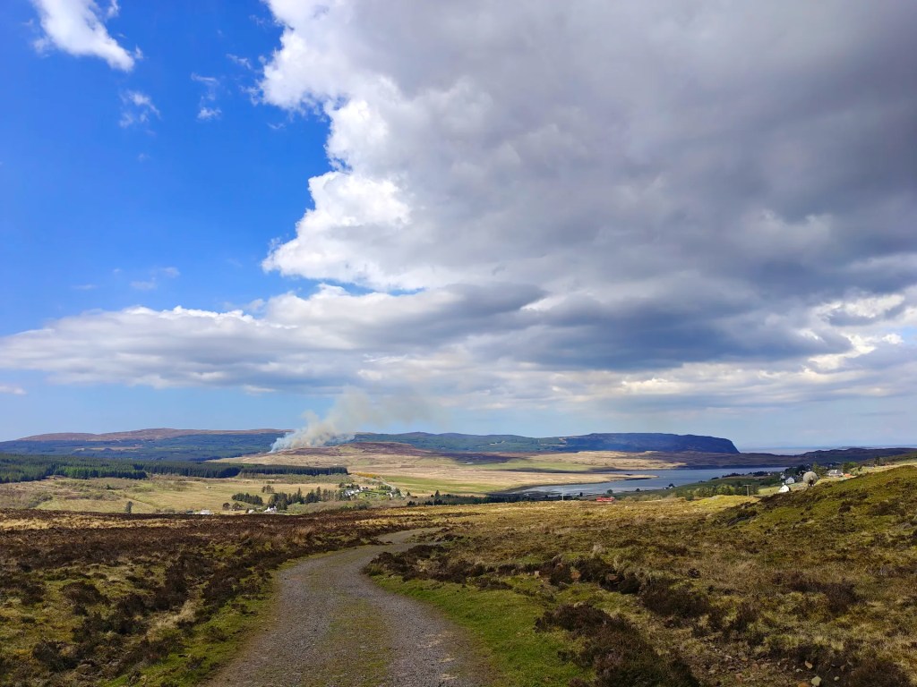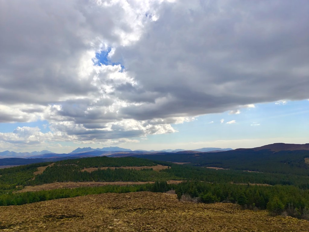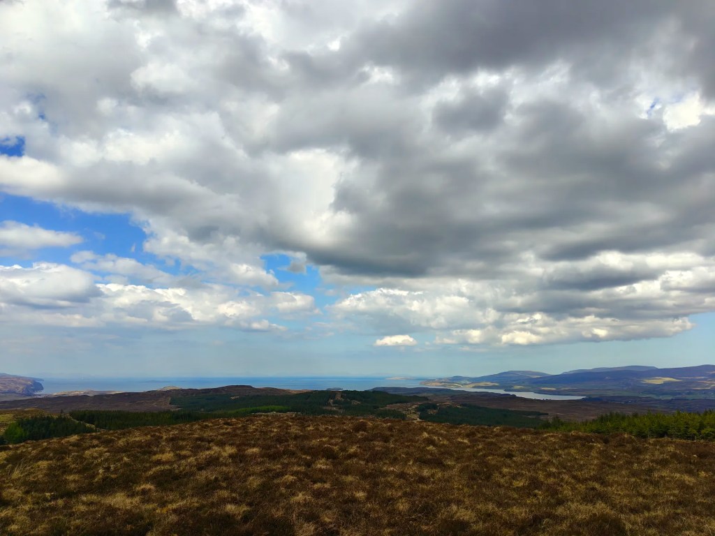 As you near the summit, the Trig Point will come into view on your left. Be sure to wander around the broad plateau at the top, the views are well worth it. On a clear day, you’ll enjoy sweeping panoramas: the Cuillin mountains rising to the southeast, Carbost tucked off to the east, and Loch Snizort stretching northward.