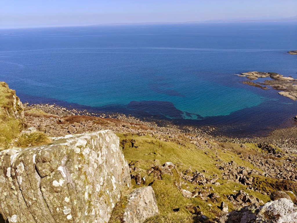 Today, Rubha nam Brathairean (Gaelic for Brothers Point) is a popular destination for visitors, but it has also been a busy settlement throughout history. Archaeologists have discovered the remains of an ancient dun (a type of fort) likely dating from the Iron Age (550 BC to 560 AD), along with what appears to be a later monastic settlement spread across the dramatic, easily defended headland. Remnants of old walls are still visible, and ancient middens filled with shells and animal bones offer a glimpse of life here long ago. Below, two grassy terraces bordered by crumbling stone banks once held small buildings, possibly monks’ cells. Today, the headland is a peaceful spot, with sweeping sea views and a deep sense of history.