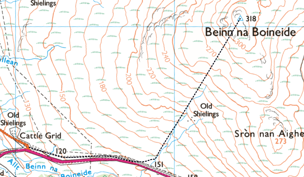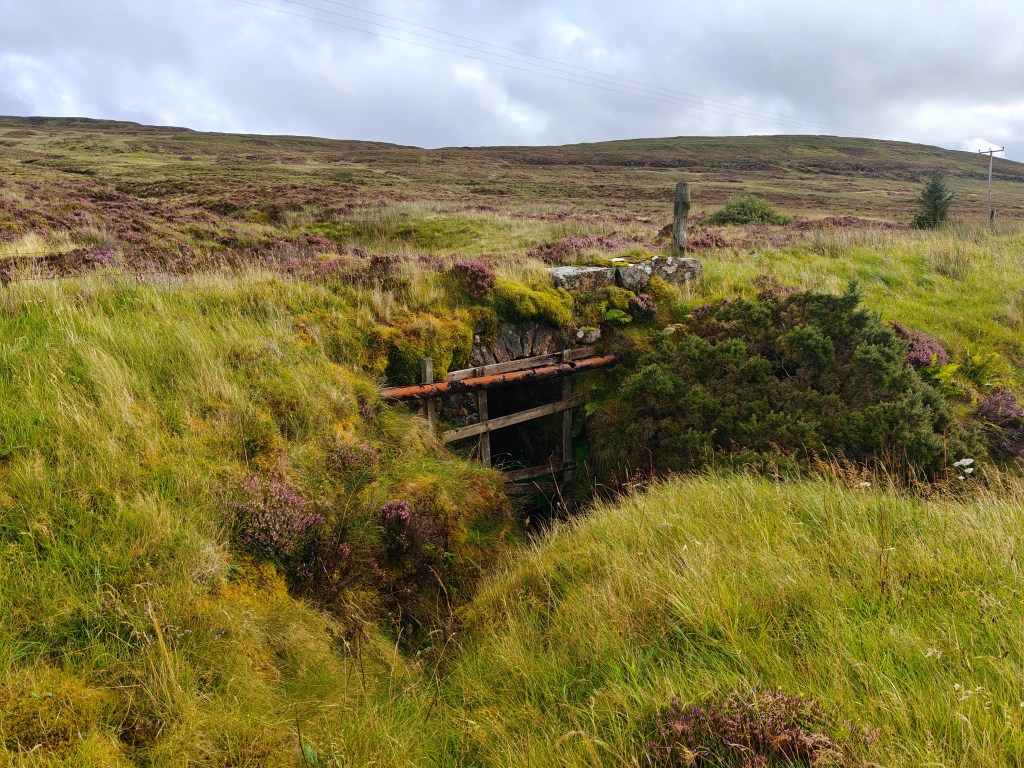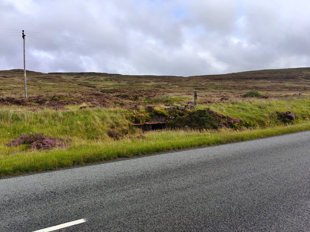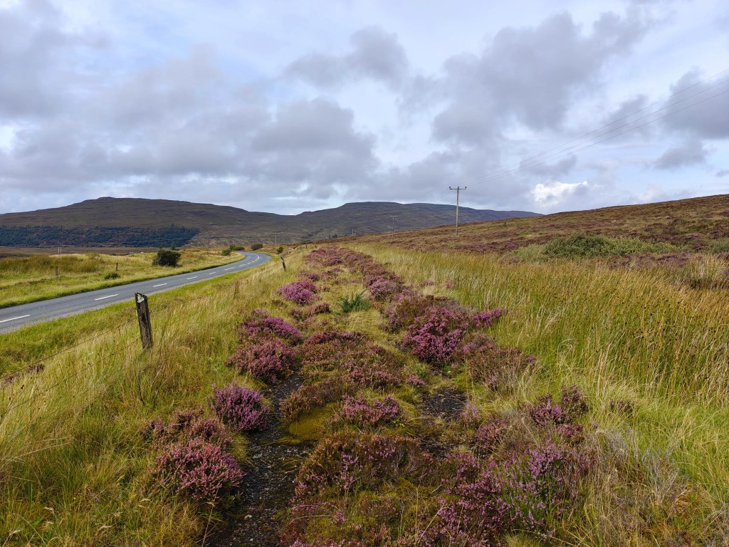 From the roadside, there are two main options for the initial approach. You can either cross the narrow drainage ditch on the east side of the road and step over the low fence to pick up the faint remains of the old road, now largely reclaimed by moss. This provides a quieter and more scenic start, running roughly parallel to the A850 for around half a mile. Alternatively, you can continue along the verge of the main road itself, keeping well clear of traffic, which can move quickly along this stretch.